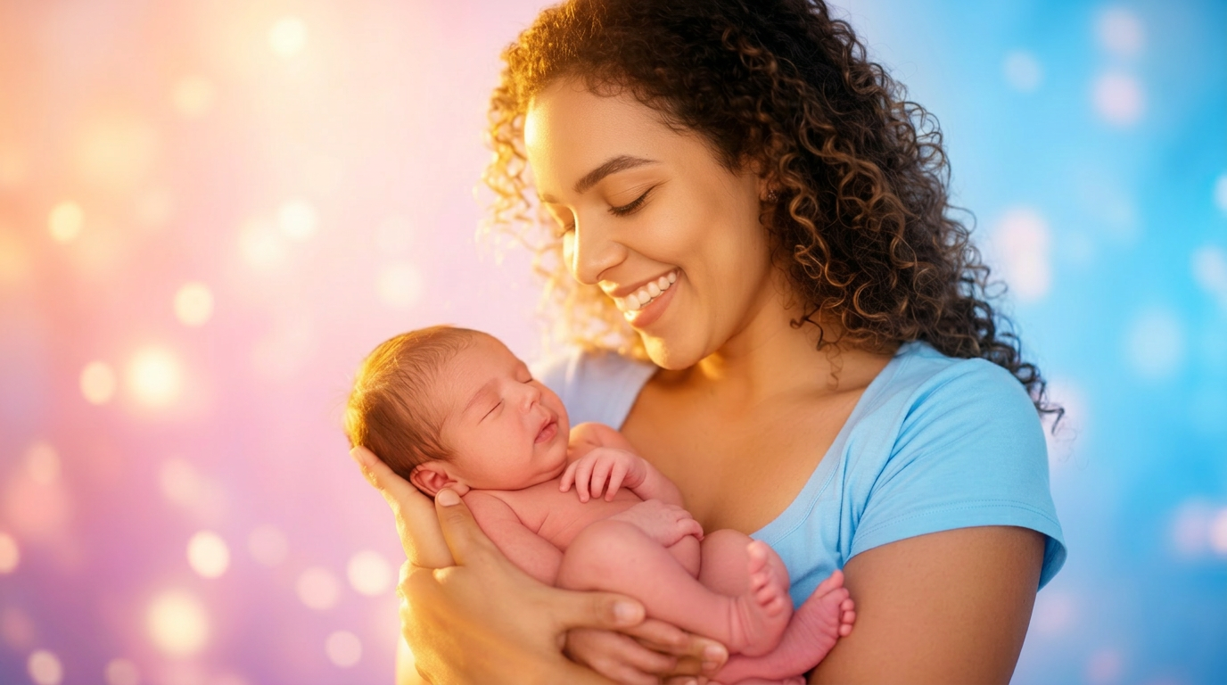 Mãe sorrindo com seu bebê recém-nascido no colo